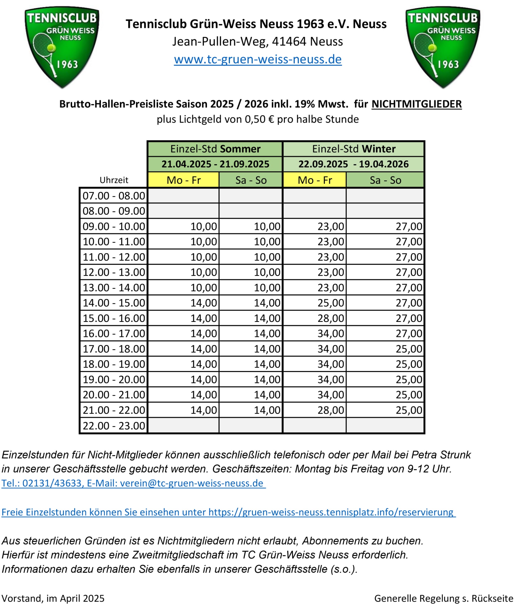 In der unten stehenden Liste sind die Preise für die Wintersaison 2025/2026 aufgeführt. Für einen Download der Liste klicken Sie bitte auf die Tabelle. Die Belegung der Halle kann aktuell hier eingesehen werden (unter Reservierung -> Halle). Im Folgenden die generell, wichtigen Regeln für die Buchung und Nutzung der Halle.