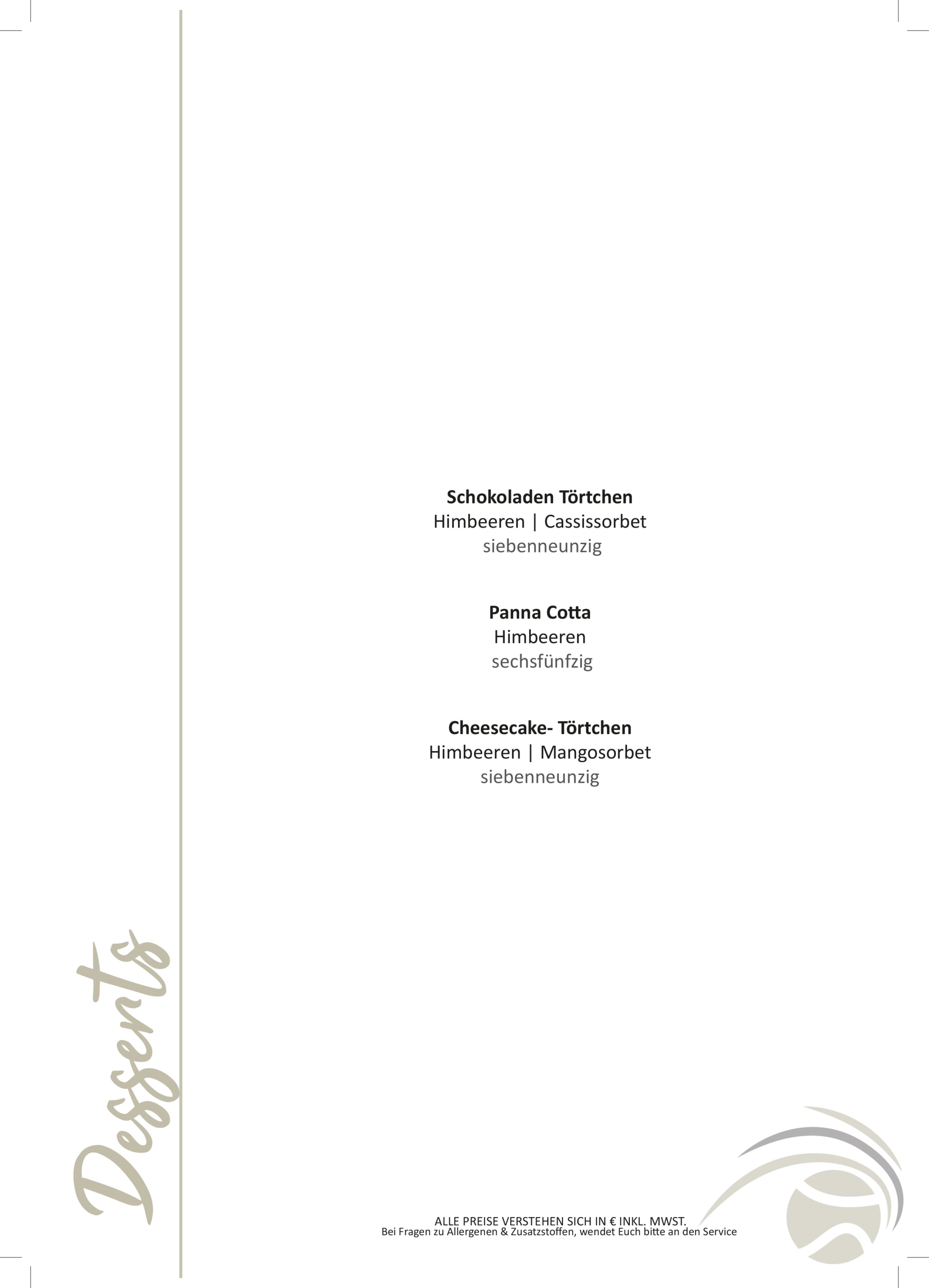 Darüber hinaus ergänzt eine kleine Spezialitätentafel im regelmäßigen Wechsel „Die Ess(-Genuss)tafel“. Auf Convenience Produkte wird weitestgehend verzichtet. Die „Trink(-Genuss)karte“ beinhaltet Biere vom Fass und in Flaschen, Softdrinks, Säfte, Spirituosen, Longdrinks, Cocktails, Heißgetränke und eine kleine Weinkarte. Weitere Angebote werden nach einer gewissen Einarbeitungs- und Eingewöhnungszeit folgen, wie z.B. „der Genuss-Shop“ mit Eis, Snacks, Süßigkeiten und/oder Geschenkideen wie Gutscheine, Weine, regionale Köstlichkeiten, etc.