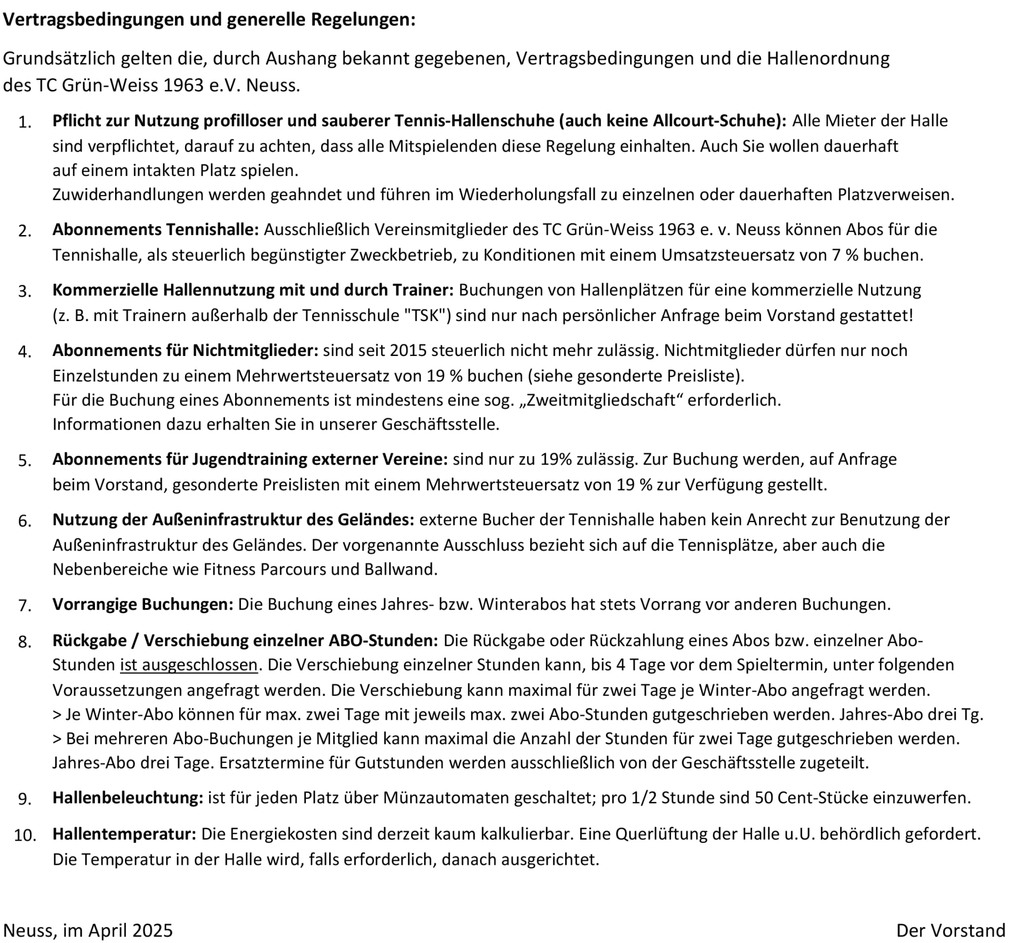 In der unten stehenden Liste sind die Preise für die Wintersaison 2025/2026 aufgeführt. Für einen Download der Liste klicken Sie bitte auf die Tabelle. Die Belegung der Halle kann aktuell hier eingesehen werden (unter Reservierung -> Halle). Im Folgenden die generell, wichtigen Regeln für die Buchung und Nutzung der Halle.